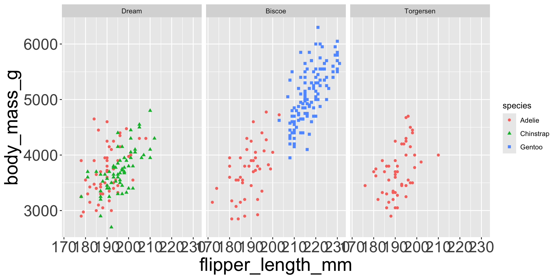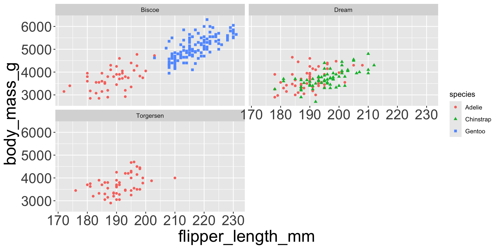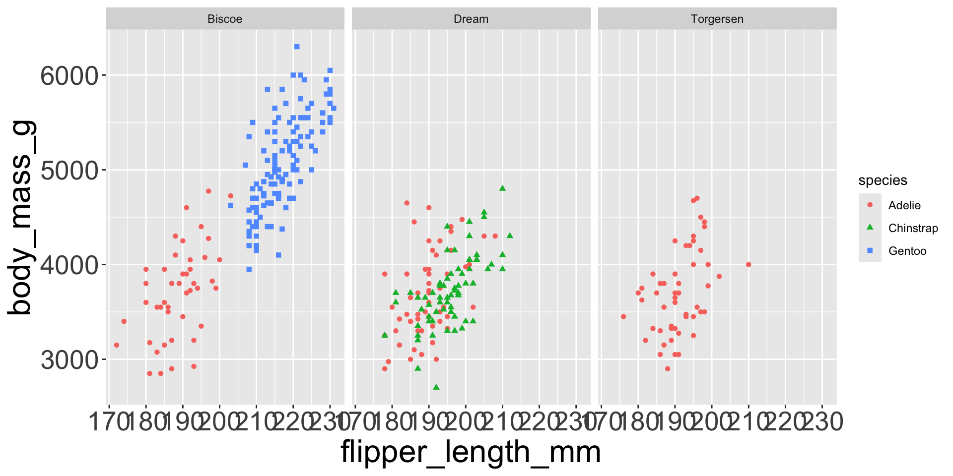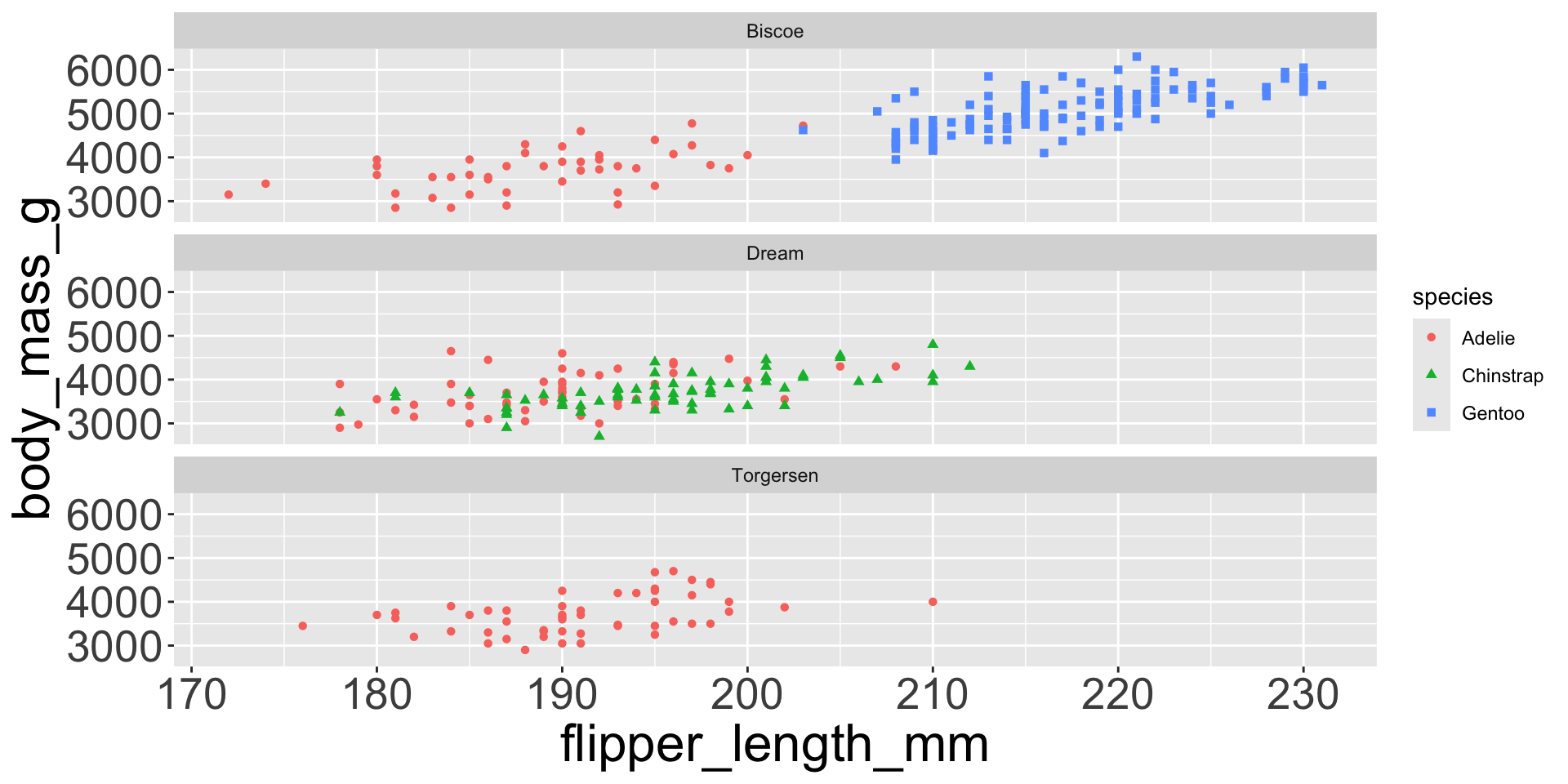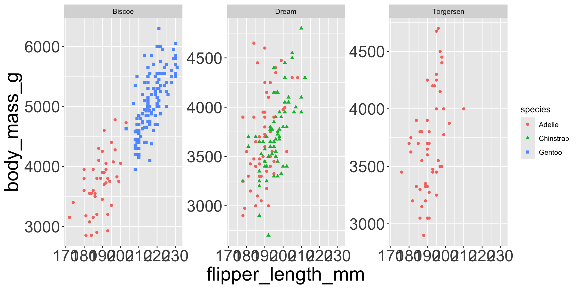 penguins |>ggplot(aes(x = flipper_length_mm, y = body_mass_g)) +geom_point(aes(color = species, shape = species)) +facet_wrap(~island, scales="free_y") # each panel now has its own y-axis scale