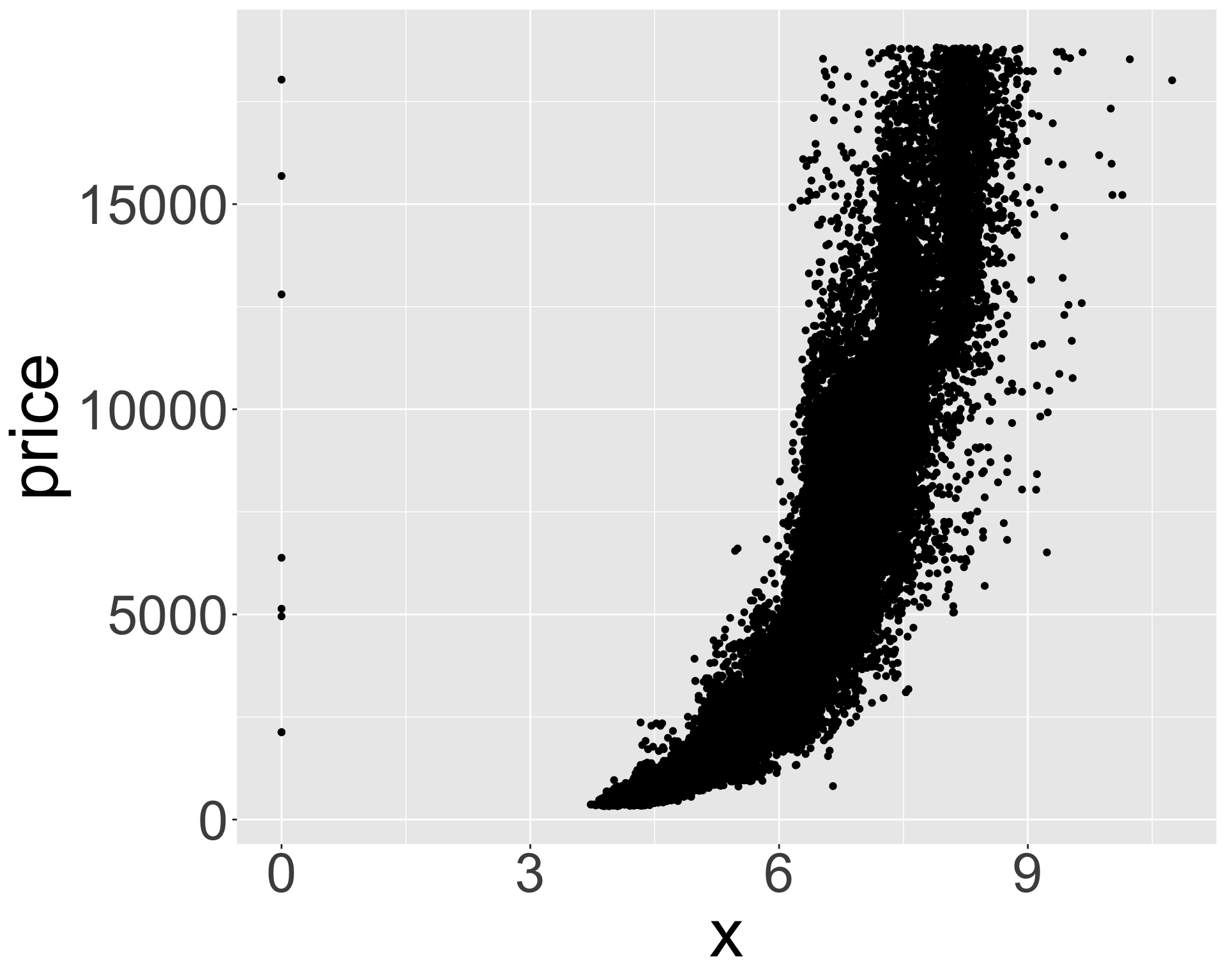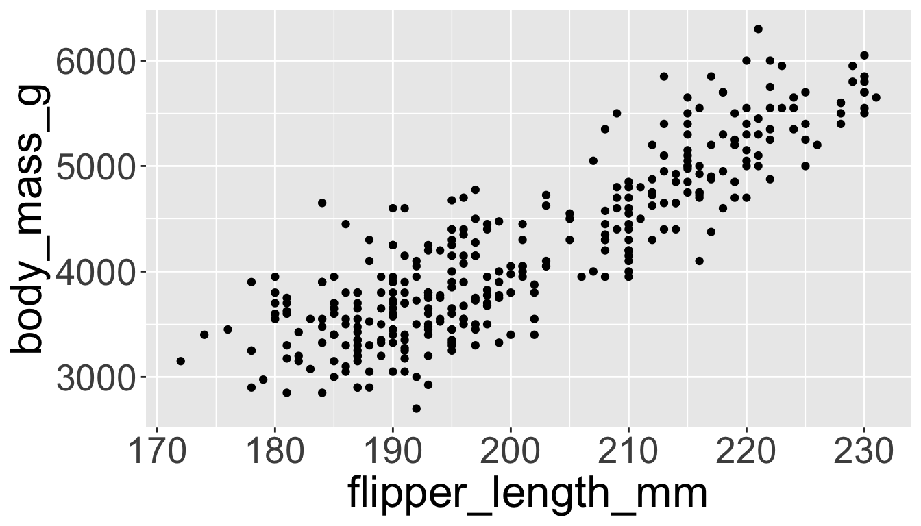 penguins |>ggplot(aes(x = flipper_length_mm, y = body_mass_g)) +geom_point()