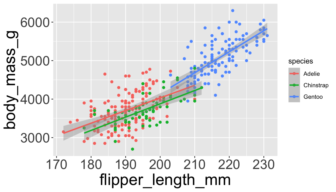When a categorical variable is mapped to an aesthetic, each unique level of the variable (here: species) gets assigned a unique aesthetic value (here: unique color)