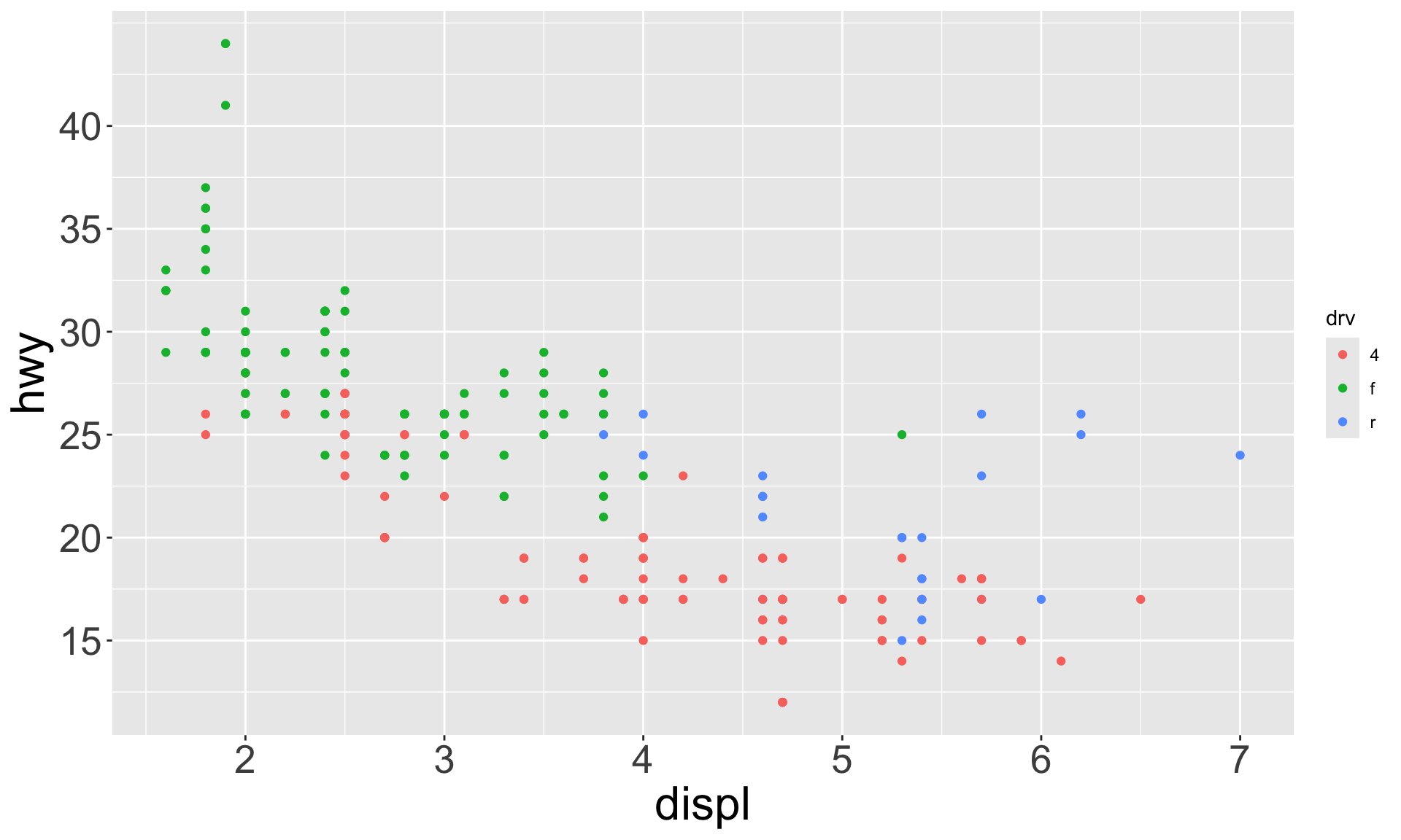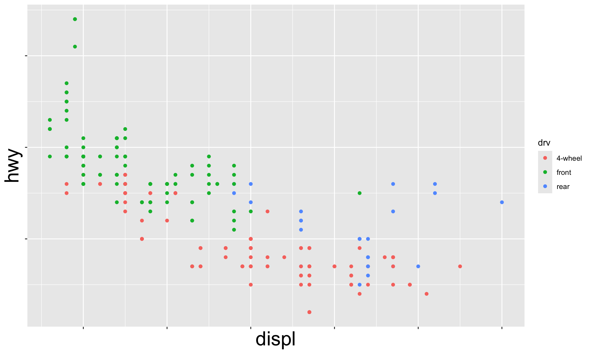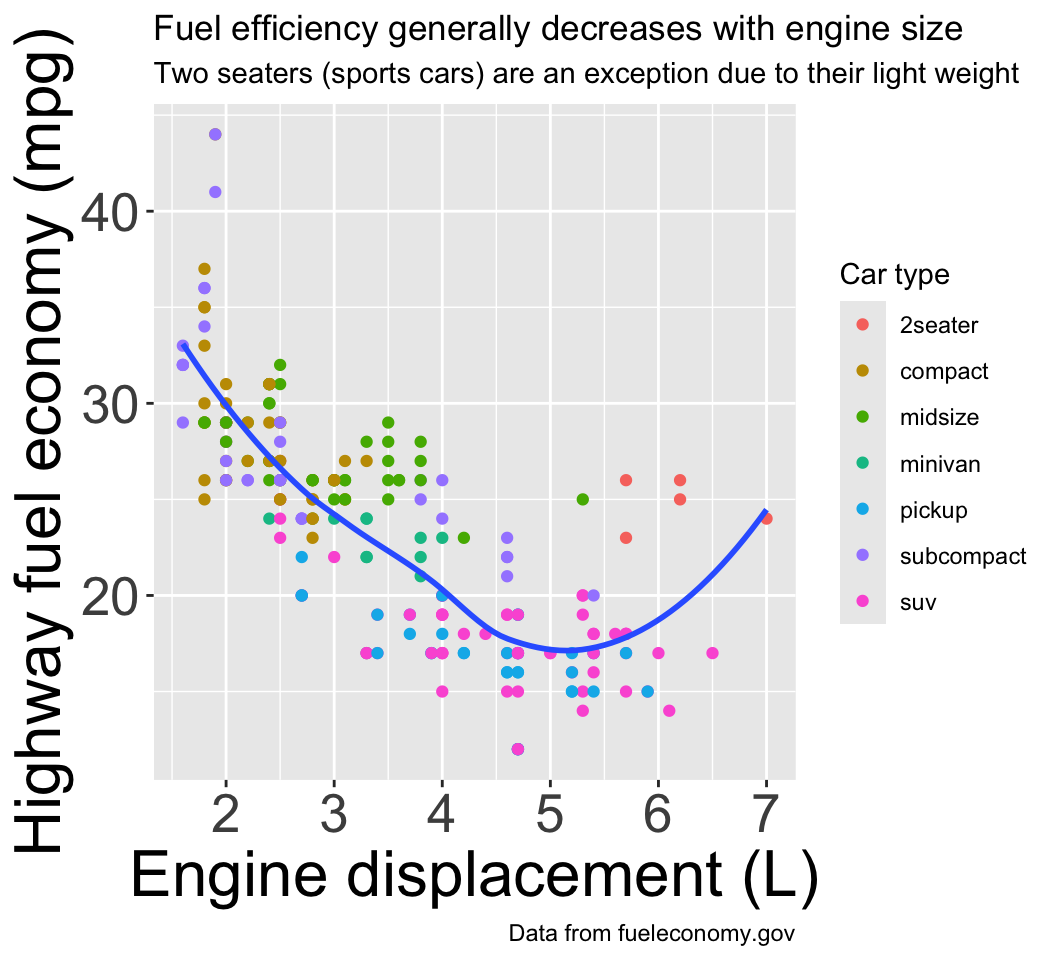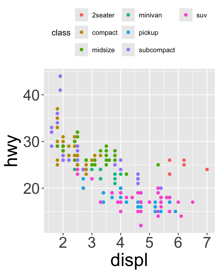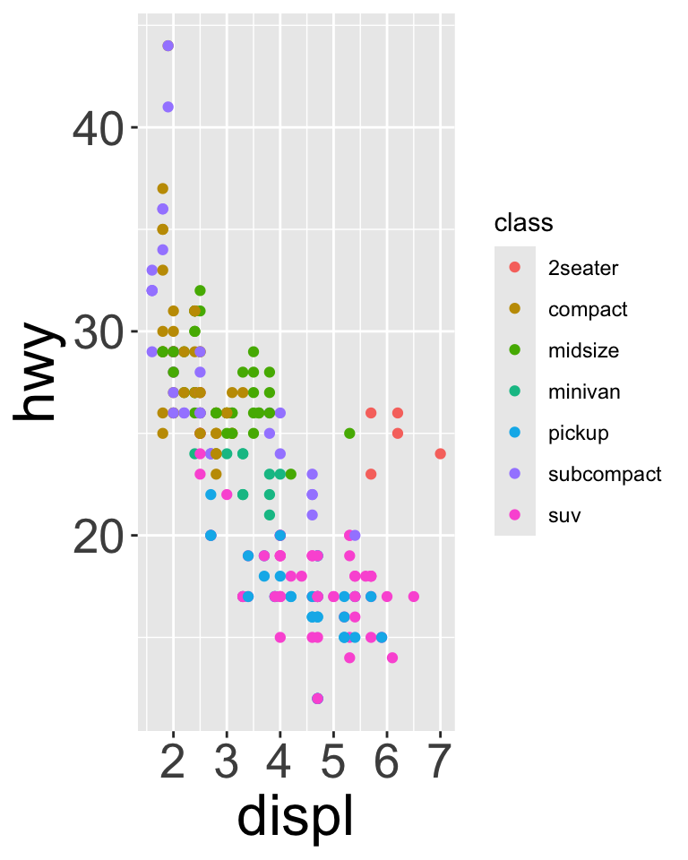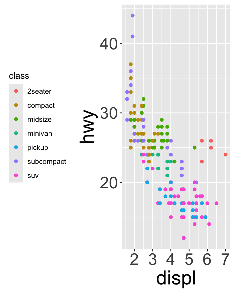 We can have aesthetics change as a function of variables inside the tibble
