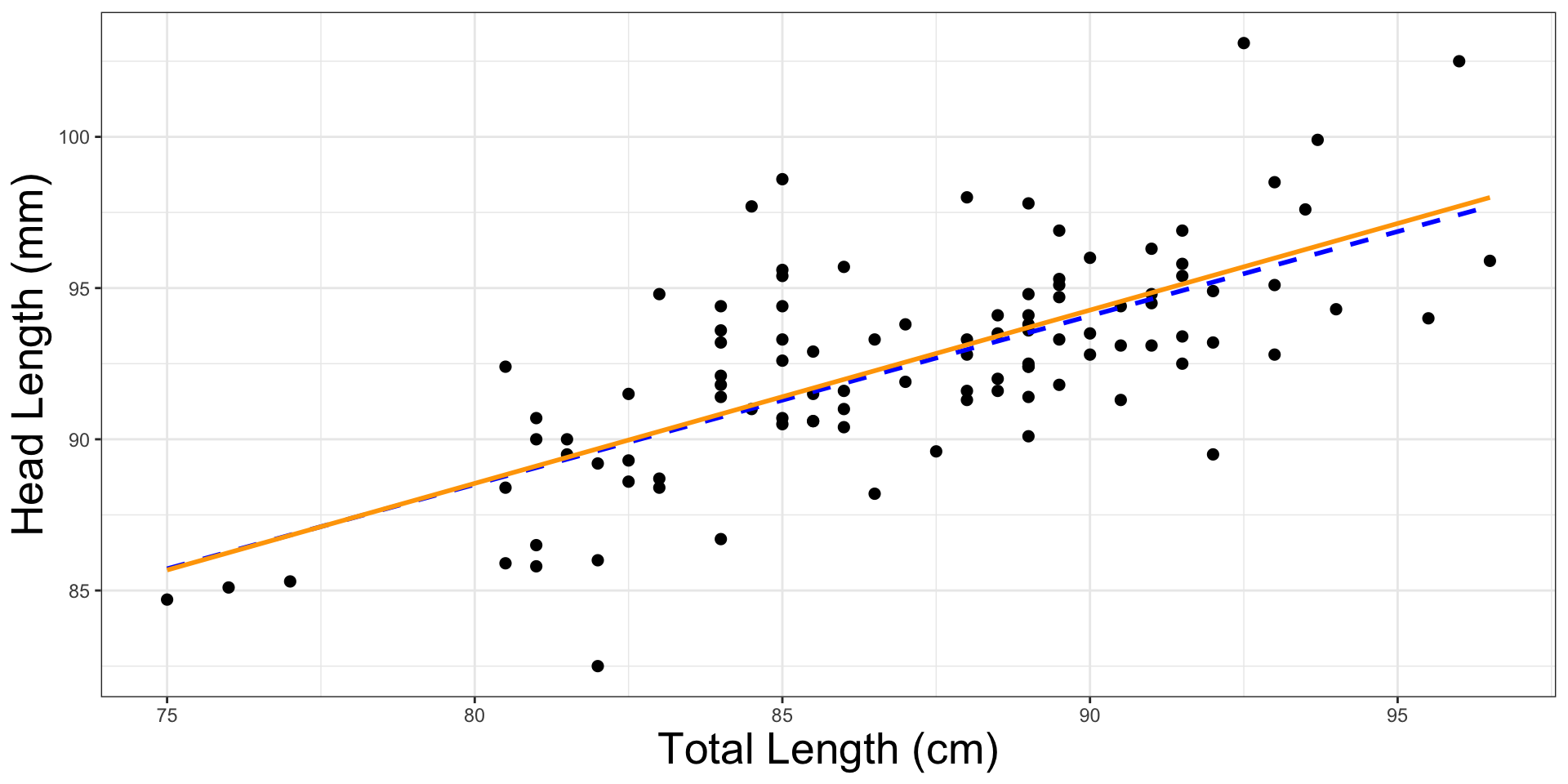 labs(x = "Total Length (cm)", y = "Head Length (mm)") + theme_bw() + theme(axis.title=element_text(size=20))Line that minimizes this least squares criterion is called the least squares line. Reasons to use this line over option 1: