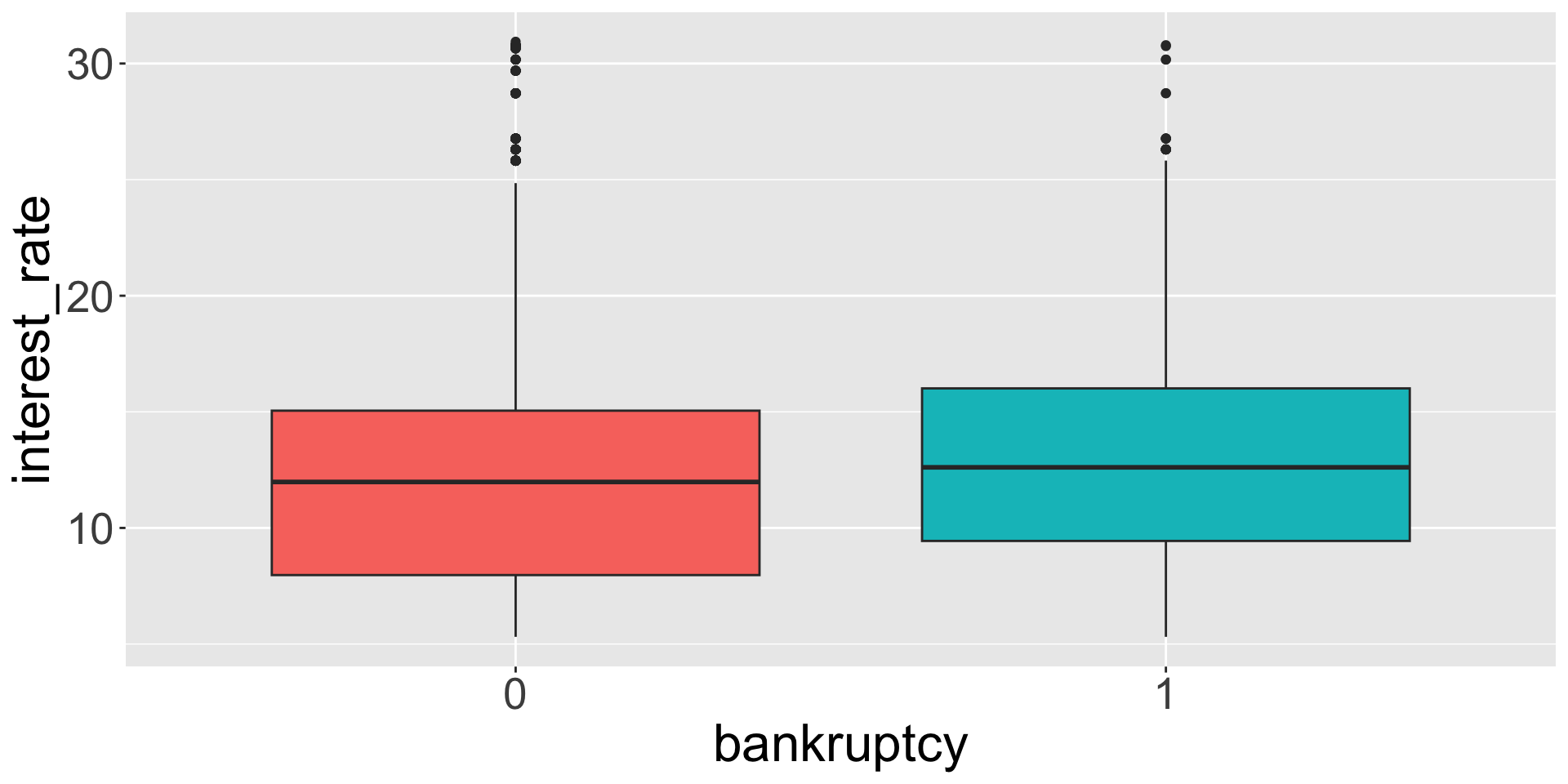 \[ \widehat{\texttt{interest_rate}} = b_0 + b_1 \times \texttt{bankruptcy} \]