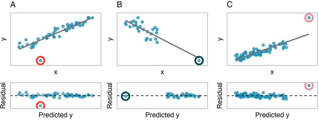 Points that fall horizontally away from the center of the cloud tend to pull harder on the line, so we call them points with high leverage or leverage points.