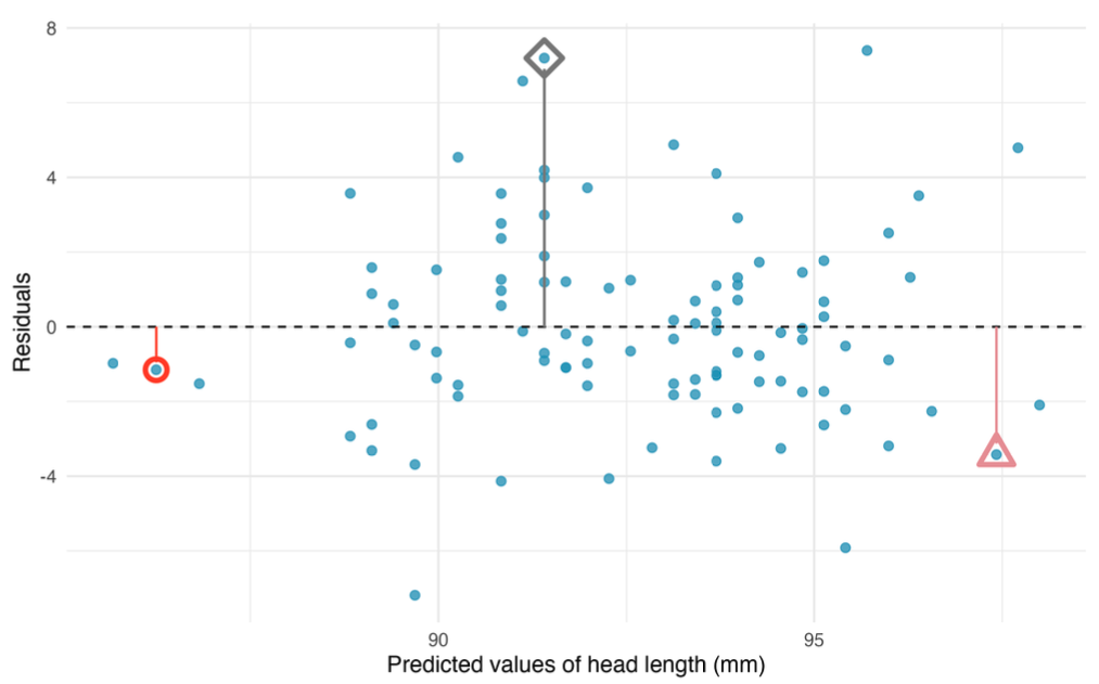 In our example: A possum with no body length is expected to have a head length of \(42.7\)mm. (Here the intercept is not meaningful because there are no observations where \(x\) is near zero. Also, a possum cannot have zero body length.)