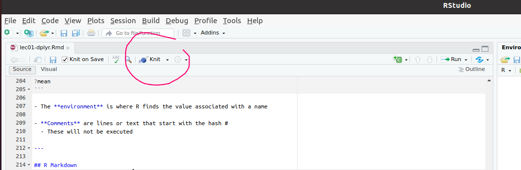 Screenshot of RStudio IDE with Knit button highlighted.
